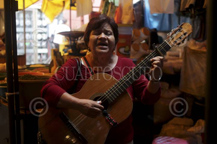 TEPOZTLÁN, MORELOS, 30JUNIO2015.- Una mujer se gana la vida cantando con su guitarra canciones tradicionales mexicanas en medio del mercado de Tepoztlán. FOTO: PATRICIA MORALES /CUARTOSCURO.COM