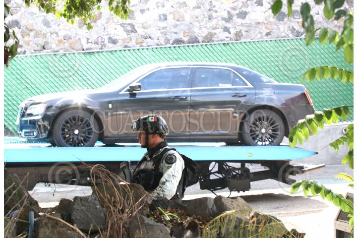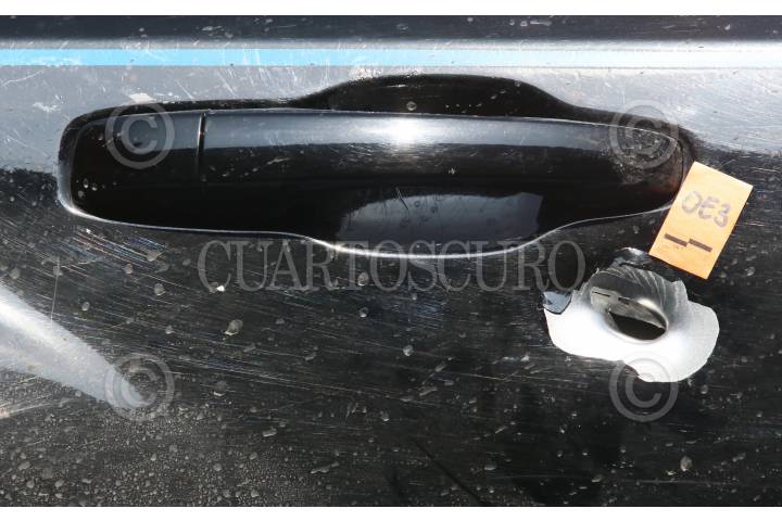 CUERNAVACA, MORELOS, 07AGOSTO2024.- Acercamiento a un impacto de arma de alto calibre en la puerta de un automóvil. La madrugada de este día un automovilista que fue atacado a balazos al norte de la capital, llegó manejando su vehículo, un Chrysler 300c, a las instalaciones de la Cruz Roja, donde recibió atención medica. El vehículo portaba las placas ENH-530-B del estado de Chihuahua, en varias partes del automóvil es podían ver pegatinas de una cuenta de red social con el nombre de usuario IVAN_GASTELUM.69. Policía del municipio y de la Guardia Nacional llegaron al sitio para resguardar la unidad, mientras peritos e investigadores de la Fiscalía levantaron indicios para la averiguación que inicia. FOTO: MARGARITO PÉREZ RETANA/CUARTOSCURO.COM