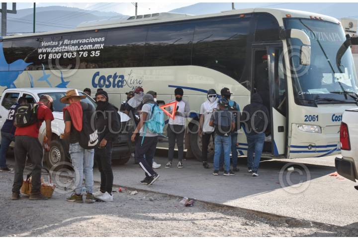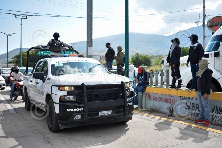 CHILPANCINGO, GUERRERO, 12NOVIEMBRE2023.- Estudiantes de la Normal Rural Raúl Isidro Burgos de Ayotzinapa cerraron de manera intermitente por casi 5 horas la Autopista del Sol, en la zona sur de la capital de Guerrero, para exigir entrega de plazas y material didáctico. Los inconformes desvalijaro camionetas de las caravanas del Bienestar que viajan a Acapulco y que intentaron llevar a su escuela. Dentro de su protesta los jóvenes retuvieron un grupo de 10 camionetas en las que viajaban Servidores de la Nación, provenientes de al menos 7 estados del país que regresaban del Puerto de Acapulco, además de que dos de ellas pertenecen al Sistema Nacional de Protección Civil. Representantes de la Secretaría de Gobernación del Estado acudieron al bloqueo para dialogar a los estudiantes, a quienes solicitaron la liberación de las camionetas que se utilizan para realizar brigadas de entrega se víveres al puerto de Acapulco. Una comisión de manifestantes fue recibida por autoridades educativas para negociar la liberación de la vía federal. En total nueve camionetas de la Secretaría del Bienestar fueron retenidas. FOTO: DASSAEV TÉLLEZ ADAME/CUARTOSCURO.COM