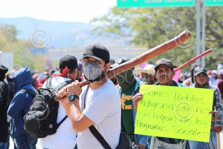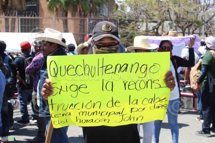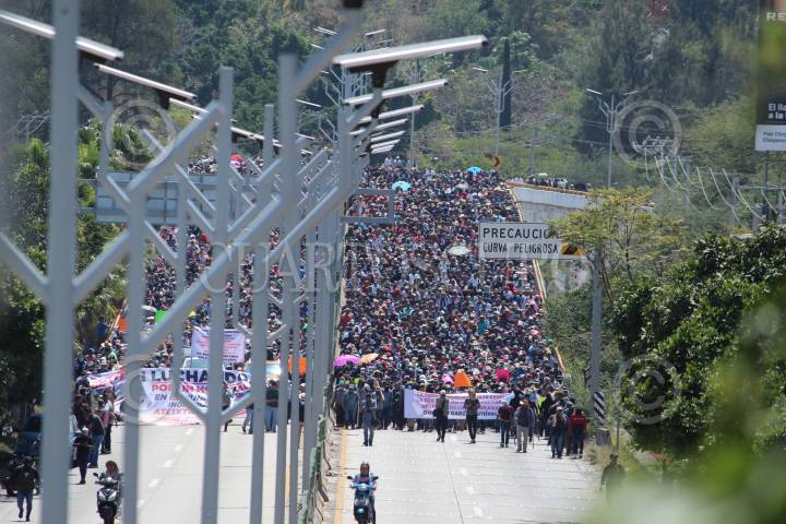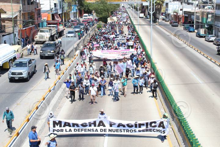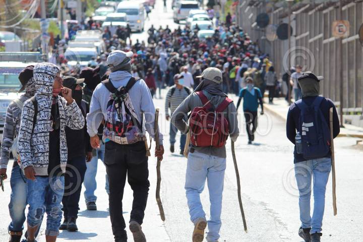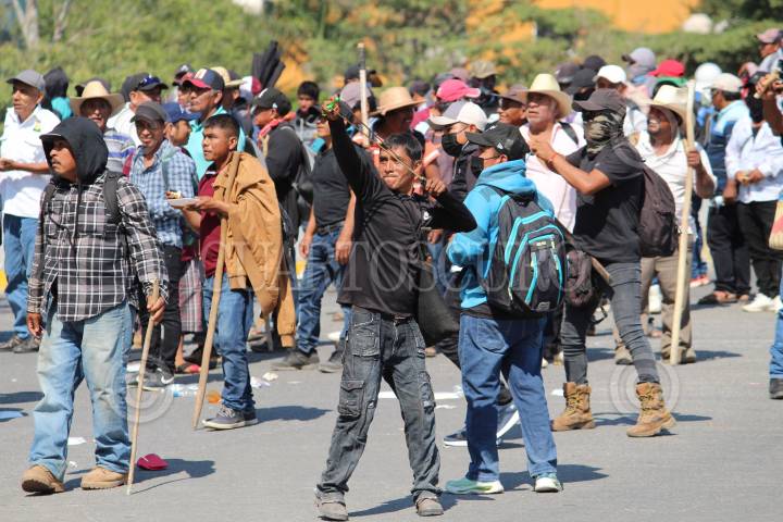 CHILPANCINGO, GUERRERO, 04MARZO2025.- Habitantes y transportistas de 13 municipios de la Montaña Baja, del Circuito Río Azul y la zona del Valle ingresaron a la capital del estado para reclamar el cumplimiento a demandas que se encuentran contenidas en un pliego petitorio, el cual fue presentado en agosto de 2023 y que aseguran, no se ha resuelto de manera satisfactoria. Para las 11:30 horas, los manifestantes llegaron a las inmediaciones del Parador del Marqués, donde de primera instancia instalaron un bloqueo en los cuatro carriles de la Autopista del Sol. Parte de los manifestantes cubren sus rostros con paliacates y con cachuchas, portan palos y en lonas en las que indican el lugar del que llegaron y cuales son las demandas que enarbolan. Entre los reclamos principales, demandan la rehabilitación de carreteras y la reconstrucción de puentes que el huracán John devastó en septiembre de 2024. La gobernadora Evelyn Salgado Pineda acudió a dialogar con los alcaldes de la Montaña baja y la región Centro de Guerrero. Antes del arribo de Salgado Pineda, un grupo de los inconformes se habría lanzado en contra de las puerta principal de Palacio de Gobierno, misma que lograron abrir por la fuerza y también lanzaron piedras utilizando resorteras para quebrar varios cristales. FOTO: DASSAEV TÉLLEZ ADAME/CUARTOSCURO.COM