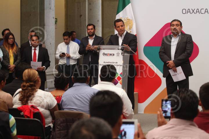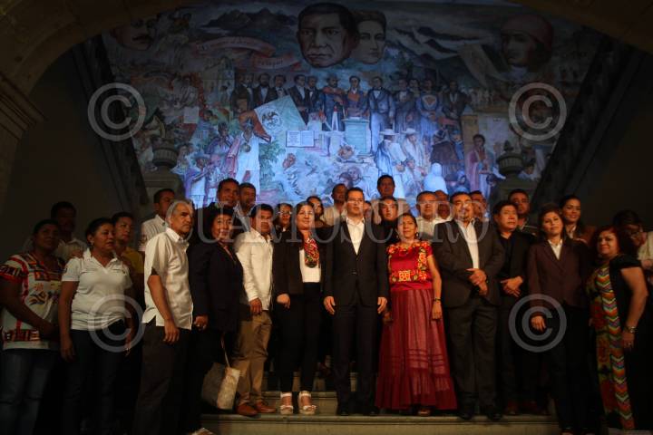 OAXACA, OAX, 02ENERO2017.- El gobernador del estado, Alejandro Murat Hinojosa entregó este lunes las acreditaciones a autoridades municipales quienes este domingo asumieron su mandato, el evento se desarrolló en el patio central del palacio de gobierno donde estuvo acompañado del secretario General de Gobierno, Alejandro Avilés. FOTO: ARTURO PÉREZ ALFONSO / CUARTOSCURO.COM