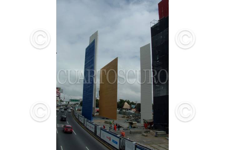 NAUCALPAN, ESTADO DE MÉXICO, 01SEPTIEMBRE2008.- La fundación Luis Barragándio dio a conocer que el Instituto Nacional de Bellas Artes (INBA), aprobó las modificaciones del proyecto original del viaducto elevado que pasará a unos metros de las Torres de Satélite, las cuales continuan siendo repintadas en sus colores originales como cuando fueron inaguradas en 1958. FOTO: MARIO NULO/CUARTOSCURO.COM