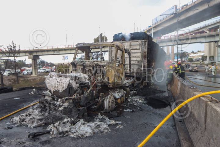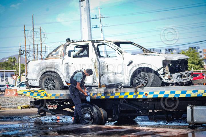 CULIACAN, SINALOA, 27NOVIEMBRE2024.- Sujetos armados incendiaron una grúa de plataforma con todo y la camioneta que transportaba en salida norte. Testigos aseguran que el grupo armado intentó bajar la pickup de la plataforma antes de provocar el incendio. El incidente ocurrió en el cruce del bulevar Rolando Arjona, conocido como Malova, y la calzada José Limón, también llamada carretera Internacional México 15 libre al norte. Según los informes, varios sujetos a bordo de otra unidad interceptaron el camión tipo plataforma en el carril de norte a sur de la calzada José Limón, frente a la plaza Carolinas. Amenazaron al conductor para que detuviera la marcha y, una vez estacionado, intentaron bajar la camioneta de la parte trasera. Sin embargo, uno de los atacantes roció gasolina a la grúa y le prendió fuego casi de inmediato. FOTO: JOSÉ BETANZOS ZÁRATE/CUARTOSCURO.COM