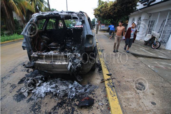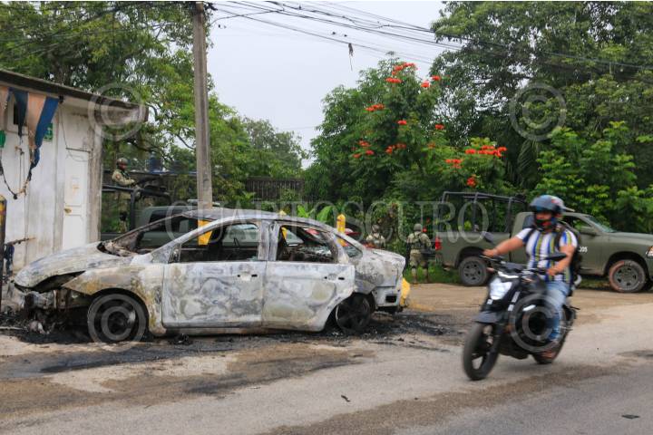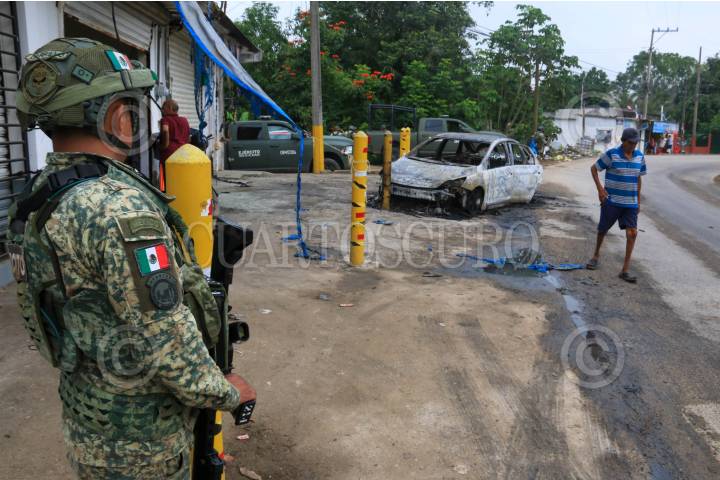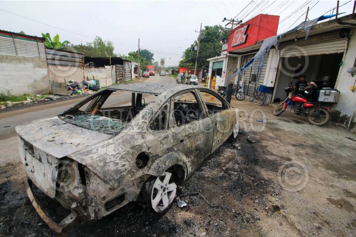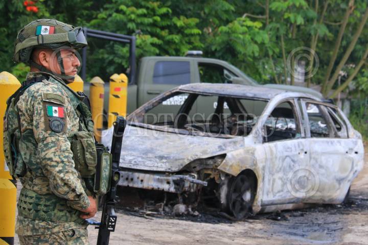 VILLAHERMOSA, TABASCO, 21ENERO2025.- El crimen organizado atacó a la población con autos incendiados y comercios. La madrugada de este martes hombres armados prendieron fuego a dos autos en la colonia Flor del Trópico, donde a la fecha suman 5 autos quemados en los últimos meses, el segundo ataque se suscitó en la población de Samarkanda, donde el ejército estableció un operativo en la zona considerada foco rojo. El ataque a la población ocurrió tres días después de la detención de Carlos Tomás Rodríguez “El Lic”del líder de la organización criminal “La Barredora” capturado en la ciudad de Puebla. FOTO: LUIS LÓPEZ/CUARTOSCURO.COM
