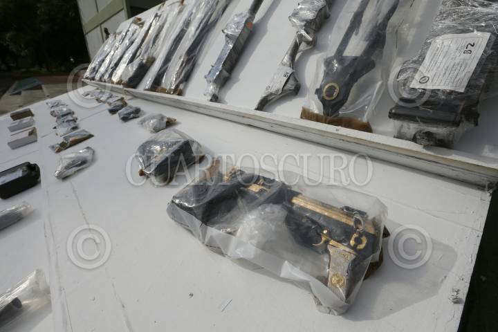 NEZAHUALCOYOTL, ESTADO DE MÉXICO, 13AGOSTO2009.- 10 presuntos delincuentes de la familia, fueron presentados en las instalaciones del Palacio Nezahualcoyotl, por elementos de la Policia Municipal. En poseción de armas largas y tres autos. Los cuales fueron detectados tras una revision de rutina en calles cercanas. FOTO: LUIS CARBAYO/CUARTOSCURO.COM