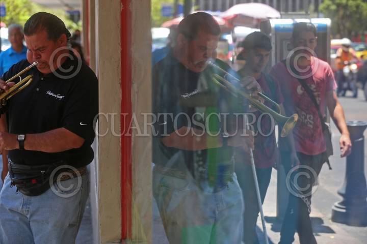 GUADALAJARA, JALISCO, 17ABRIL2019.- Una persona invidente se gana la vida tocando la trompeta, esto a las afueras de una tienda de autoservicio ubicada en las calles de Colón casi esquina con Prisciliano Sánchez en el centro de la ciudad. FOTO: FERNANDO CARRANZA GARCIA / CUARTOSCURO.COM