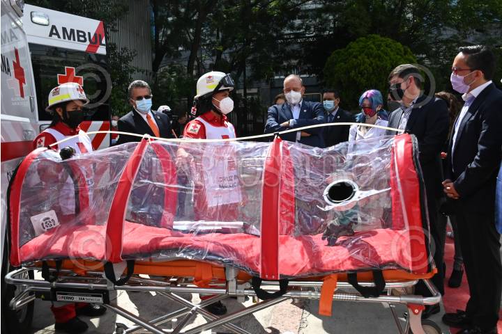 Paramédicos muestran la cápsula de protección para pacientes con Covid-19 la cual es uno de los elementos con los que cuenta la ambulancia recién donada.