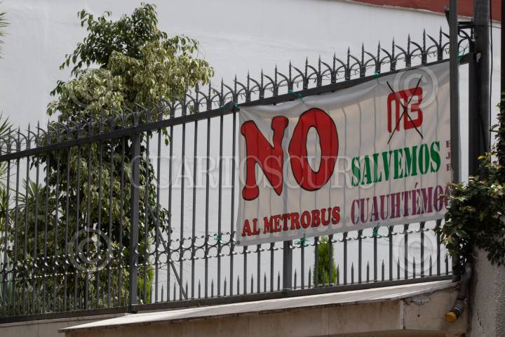 Vecinos de la colonia Santa Cruz Atoyac han colocado mantas de rechazo a la construcción del Metrobus Línea 3 en avenida Cuauhtémoc y Eje 8.