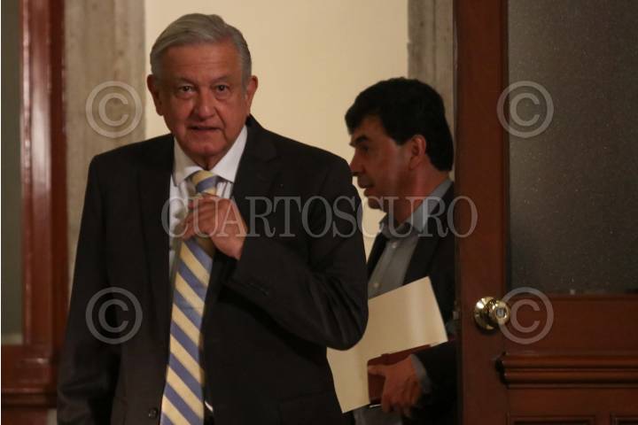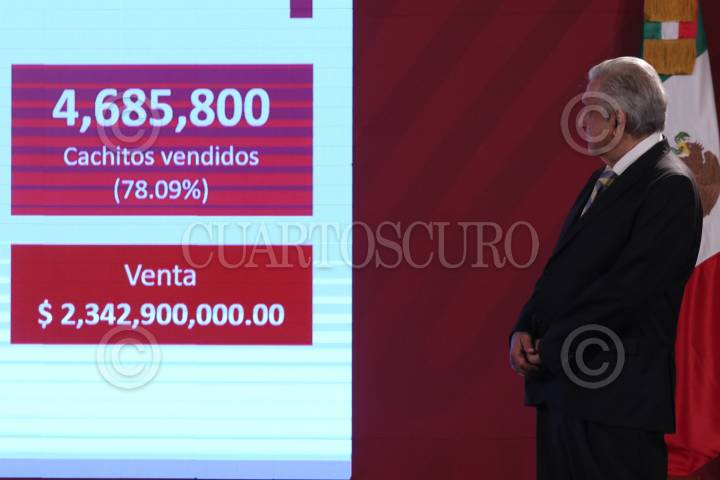 Andrés Manuel López Obrador durante la conferencia de prensa donde se expusieron los resultado del sorte del avión presidencial.
