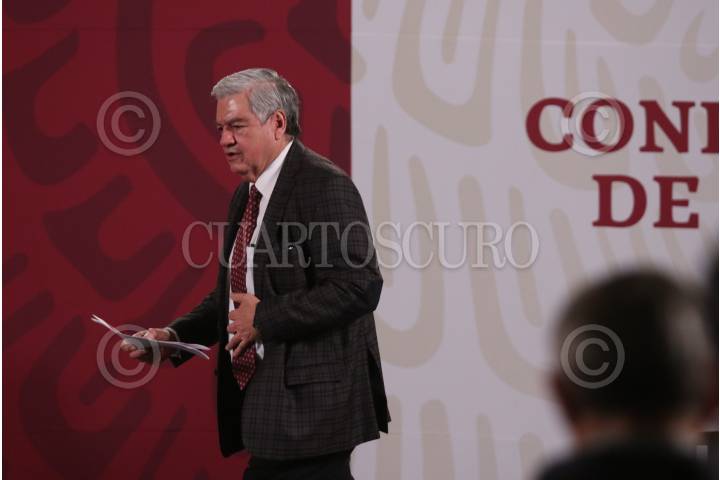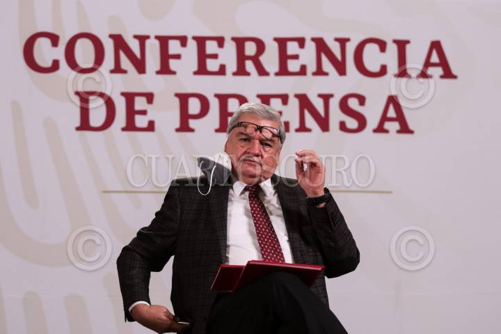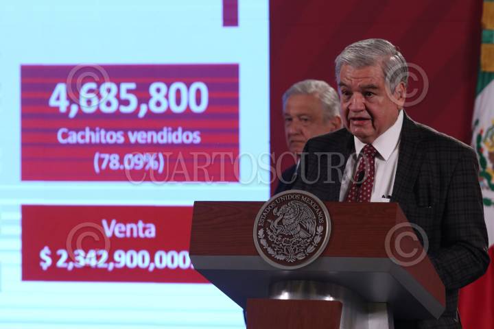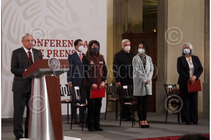 Andrés Manuel López Obrador, presidente de México, acompañado de Gisela Lara Saldaña, titular de la Unidad del Programa IMSS-Bienestar; Galia Borja Gómez, tesorera de la Federación; Margarita González Sarabia, directora general de la Lotería Nacional para la Asistencia Pública; Jorge Mendoza Sánchez, director general de Banobras y Ernesto Prieto Ortega, director general del Instituto para Devolver al Pueblo lo Robado (Indep), durante la conferencia matutina en Palacio Nacional.