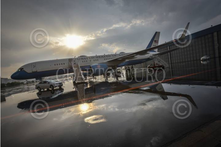 El avión con matrícula 90003 que trasladará a Kamala Harris, vicepresidenta de los Estados Unidos, se mantiene en la base aérea militar número 19 luego de presentarse lluvia moderada.