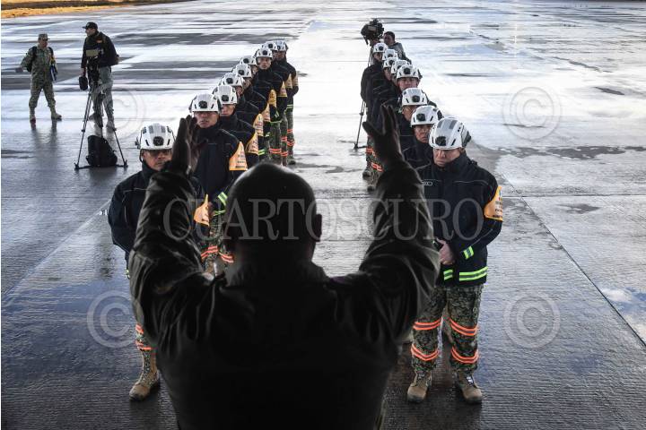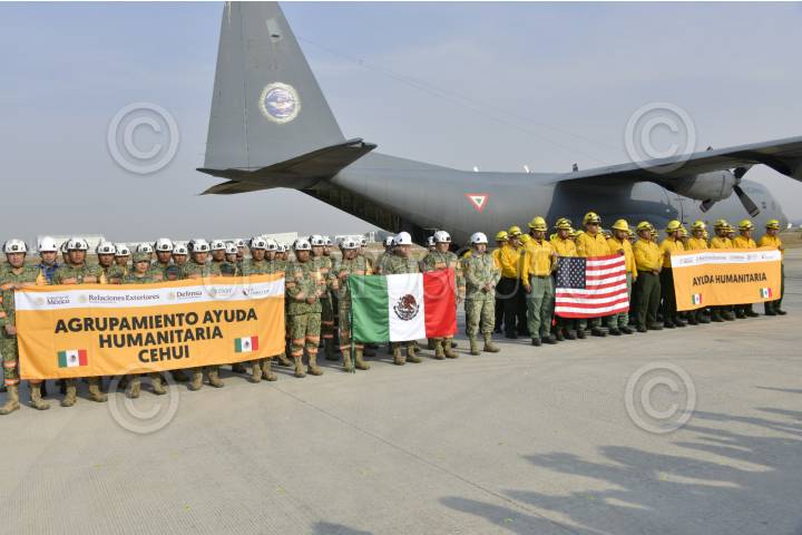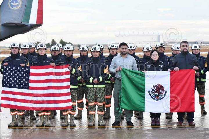 ZUMPANGO, ESTADO DE MÉXICO, 25ENERO2025.- Integrantes del Agrupamiento de Ayuda Humanitaria CEHUI de la Secretaria de la Defensa Nacional (SEDENA) regresaron a las inmediaciones de la Base Aérea de Santa Lucía luego de prestar servicios de apoyo para apagar los incendios en Los Ángeles, Estados Unidos. FOTO: SEDENA/CUARTOSCURO.COM