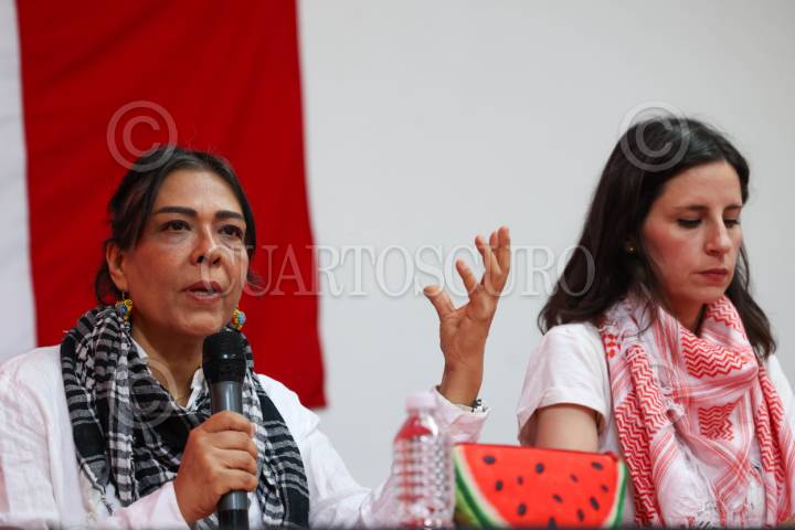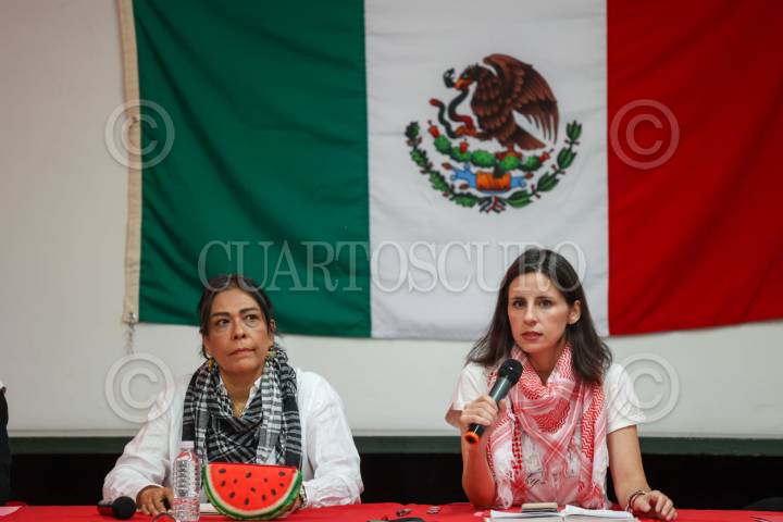 CIUDAD DE MÉXICO, 05AGOSTO2025.- Dolores Pérez Lazcarro, integrante de Global Movement to Gaza; y Patricia Luévano, coordinadora internacional del Movimiento Global a Gaza, ofrecieron una rueda de prensa para hablar sobre la iniciativa humanitaria de llevar ayuda a la Franja de Gaza en doce embarcaciones, y convocaron a la sociedad civil a sumarse a este esfuerzo ya que señalaron que hay miles de niños con peligro de morir de hambre. También invitaron a ciudadanos que estén interesados en formar parte de las flotillas se pueden inscribir en las cuentas oficiales del movimiento. Dieron a conocer que le delegación mexicana está conformada por activistas, periodistas, artistas, médicos, estudiantes y voluntarios, esto durante el encuentro con medios de comunicación y gente interesa en el tema que se llevó a cabo en el Club de Periodistas. FOTO: MOISÉS PABLO/CUARTOSCURO.COM