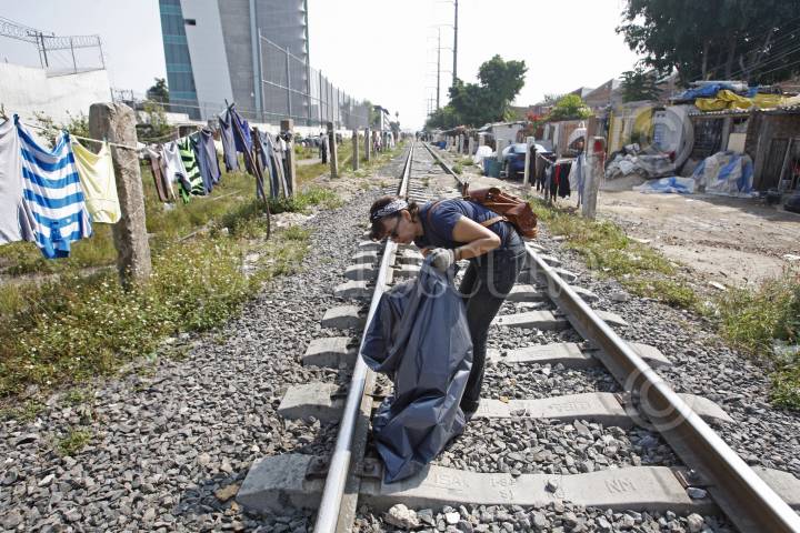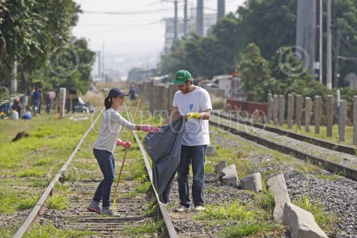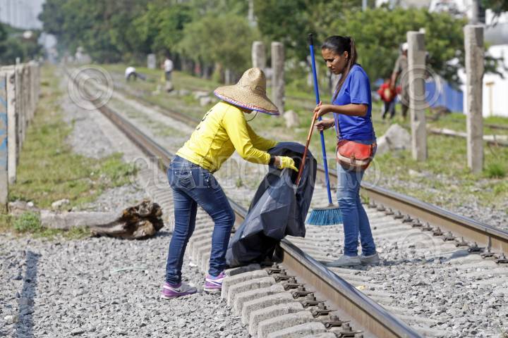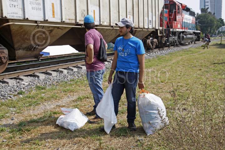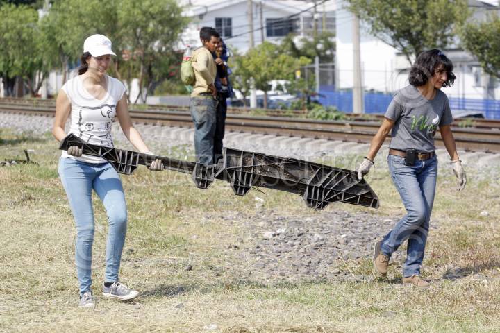 GUADALAJARA, JALISCO. 21NOVIEMBRE2015.- Hoy en el marco de la campaña coordinada entre Amnistía Internacional y Fm4 Paso Libre, se realizo la "Intervención y rehabilitación del espacio en vías del tren e instalación de señalamientos de la nueva casa FM4 de apoyo al migrante", en donde un grupo de voluntarios y activistas trabajaron en el área de las vías cercana al Centro de Atención al Migrante de Fm4 Paso Libre (Av. Inglaterra entre Calderón de la Barca y Lope de Vega) para recuperar los espacios que son de todas/os y ayudar en la construcción de crear una comunidad hospitalaria, unida e incluyente con la población migrante. FOTO: FERNANDO CARRANZA GARCIA / CUARTOSCURO.COM