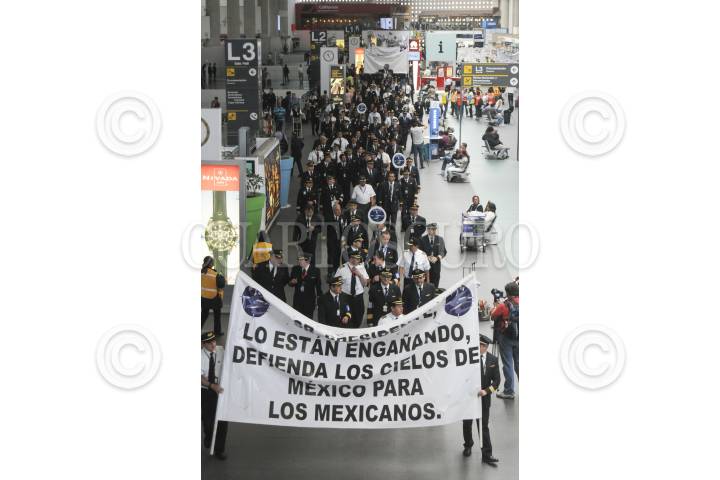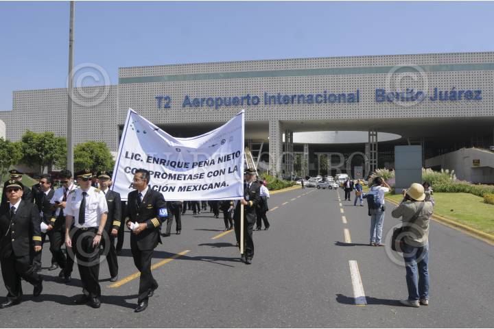 MÉXICO, D.F., 22SEPTIEMBRE2015.- Integrantes del Frente por la Defensa de la Aviación Nacional conformados por la Asociación Sindical de Pilotos Aviadores de México (ASPA), Sindicato de Sobrecargos de Aviación (ASSA) y el Sindicato de Trabajadores de Tierra, marcharon de la Terminal 2 a la Terminal 1 del Aeropuerto Internacional de la Ciudad de México en rechazo al convenio en materia de aviación entre México y Estados Unidos. FOTO: SAÚL LÓPEZ /CUARTOSCURO.COM