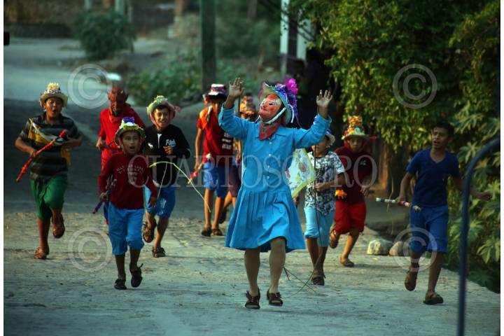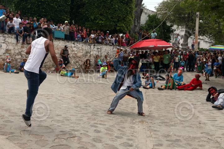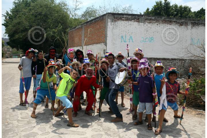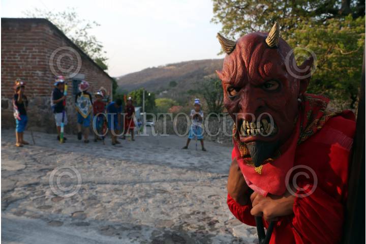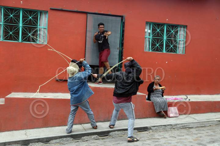 TLAQUILTENANGO, MORELOS, 30MARZO2018.-Los habitantes del pueblo de Huautla (situado al extremo sur del estado), participan de la celebración de Viernes Santo, cuya singularidad recae en un grupo que se denomina "Mototocos” (portando una máscara roja de edad antiquísima, y que son Judas, Barrabás y Batea, así como una mujer llamada Linterna o Mototoca) que recorre las calles y representa a los soldados romanos. Junto con los niños, los "Mototocos" azotan con varas largas a quienes los retan con un canto “Mototoco, viejo loco” o aventándoles agua. FOTO: MARGARITO PÉREZ RETANA /CUARTOSCURO.COM