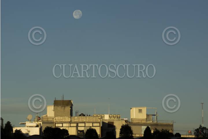 MÉXICO, DF., 18MARZO2014.- Aurora, alba, amanecer, crepúsculo matutino. En la hora de todas las cosas, la luna asciende transparente sobre el perfil de las azoteas urbanas. FOTO: MARÍA JOSÉ MART´INEZ /CUARTOSCURO.COM