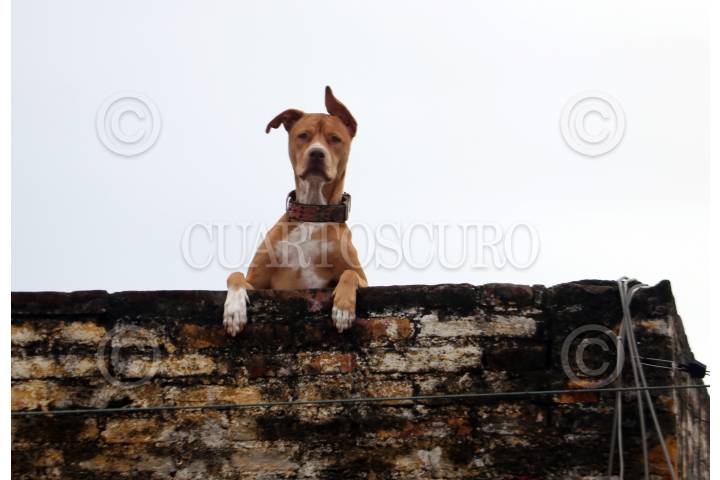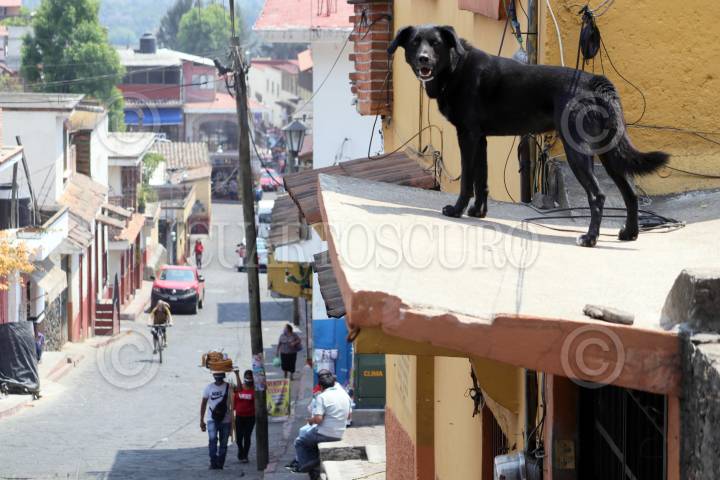 Un perro confinado en una azotea en el pueblo de Tepoztlán ladra a la gente que pasa por la calle.