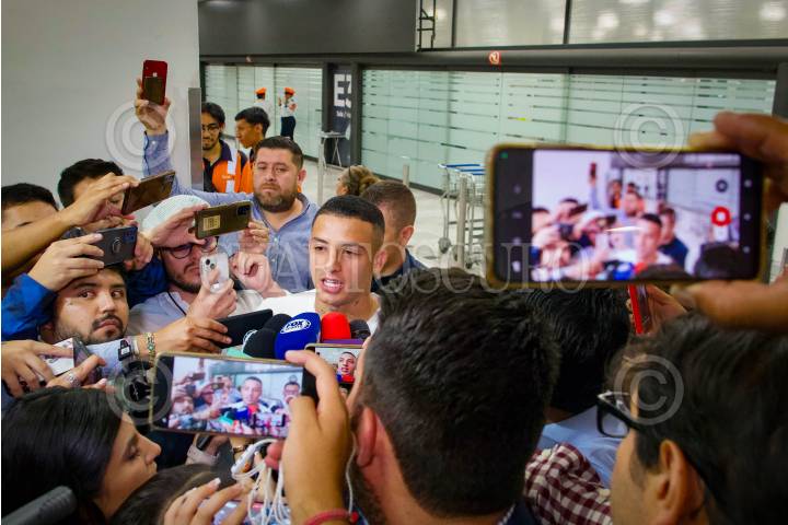 Pedro Aquino jugador peruano durante su llegada a la Ciudad de México para reportarse con el club América.