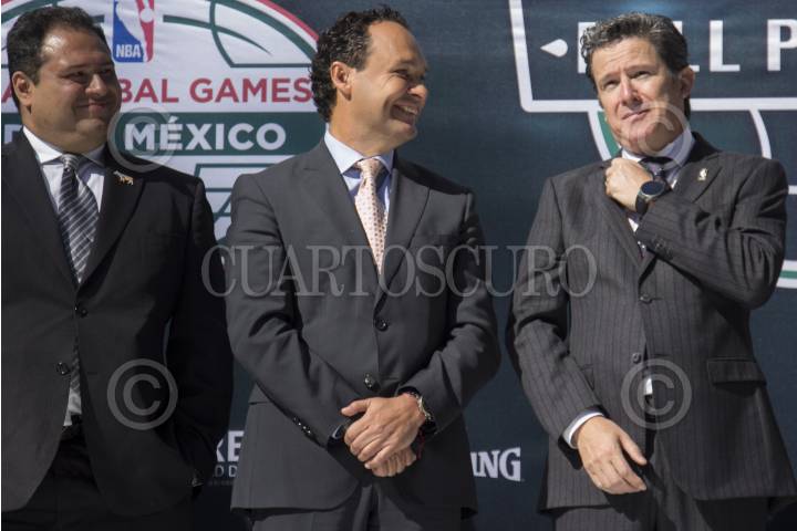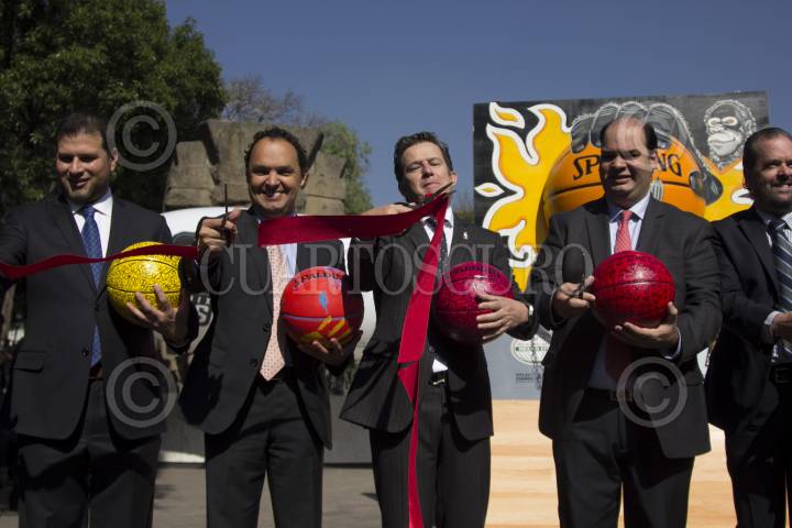 CIUDAD DE MÉXICO, 12ENERO2017.- Ignacio Hutt, director general de Alazraki Sports (centro), y Raúl Zarraga, director general de NBA México, durante la inauguración del NBA Ball Parade. Exposición colocada sobre Paseo de la Reforma, frente al museo de Antropología, la cual cuenta con 15 balones representativos de la equipos de la NBA decorados por artistas mexicanos. Esto con motivo de los dos juegos de temporada regular disputados hoy y el sábado, entre los Soles de Phoenix y los Maveriks de Dallas, y los Soles contra los Spurs de San Antonio. FOTO: GALO CAÑAS /CUARTOSCURO.COM