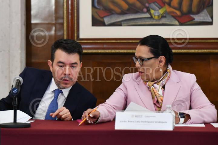 CIUDAD DE MÉXICO, 23JULIO2025.- Froylán Enciso Higuera, titular de la Unidad para la Defensa de los Derechos Humanos, y Rosa Icela Rodríguez, secretaria de Gobernación, durante la conferencia de prensa en la que se informaron los avances sobre la construcción de la nueva Ley General en Materia de Desaparición de Personas, la cual prioriza la participación directa de colectivos de víctimas y familias de personas desaparecidas. FOTO: MARIO JASSO/CUARTOSCURO.COM