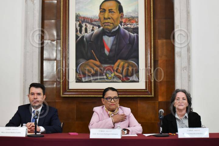 CIUDAD DE MÉXICO, 23JULIO2025.- Arturo Medina, subsecretario de Derechos Humanos; Rosa Icela Rodríguez, secretaria de Gobernación, y Sara Irene Herrerías, titular de la Fiscalía Especializada en Materia de Derechos Humanos, durante la conferencia de prensa en la que se informaron los avances sobre la construcción de la nueva Ley General en Materia de Desaparición de Personas, la cual prioriza la participación directa de colectivos de víctimas y familias de personas desaparecidas. FOTO: MARIO JASSO/CUARTOSCURO.COM