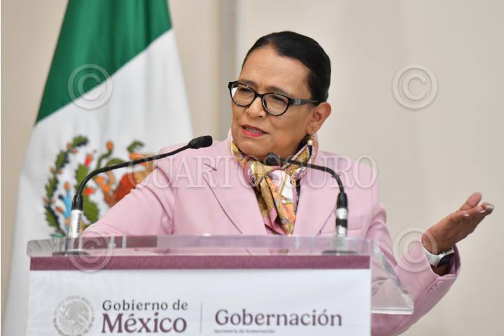 CIUDAD DE MÉXICO, 23JULIO2025.- Rosa Icela Rodríguez, secretaria de Gobernación, durante la conferencia de prensa en la que se informaron los avances sobre la construcción de la nueva Ley General en Materia de Desaparición de Personas, la cual prioriza la participación directa de colectivos de víctimas y familias de personas desaparecidas. FOTO: MARIO JASSO/CUARTOSCURO.COM