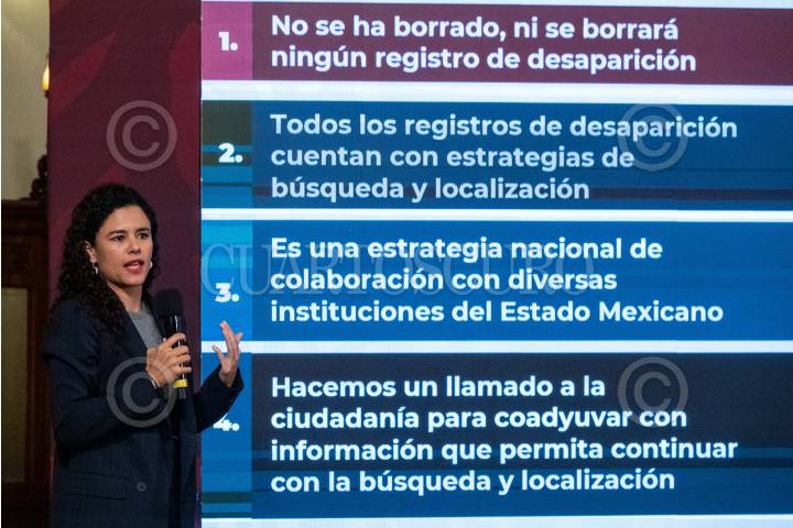 CIUDAD DE MÉXICO, 27DICIEMBRE2023.- Luisa María Alcalde, secretaria de Gobernación durante la conferencia matutina desde Palacio Nacional en donde presentó detalles sobre la Estrategia Nacional de Búsqueda Generalizada. FOTO: GALO CAÑAS/CUARTOSCURO.COM
