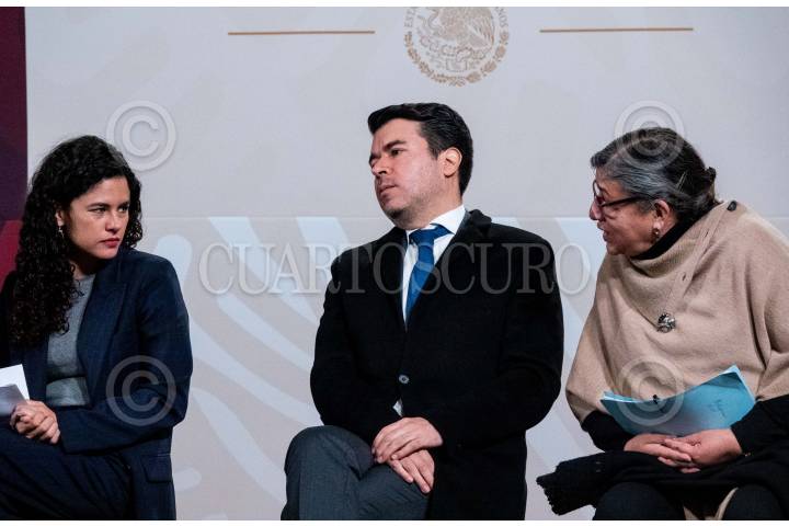 CIUDAD DE MÉXICO, 27DICIEMBRE2023.- Luisa María Alcalde, secretaria de Gobernación; Félix Arturo Medina, subsecretario de Derechos Humanos, Población y Migración, y Teresa Guadalupe Reyes Sahagún, comisionada Nacional de Búsqueda, durante la conferencia matutina desde Palacio Nacional en donde se presentaron detalles sobre la Estrategia Nacional de Búsqueda Generalizada. FOTO: GALO CAÑAS/CUARTOSCURO.COM