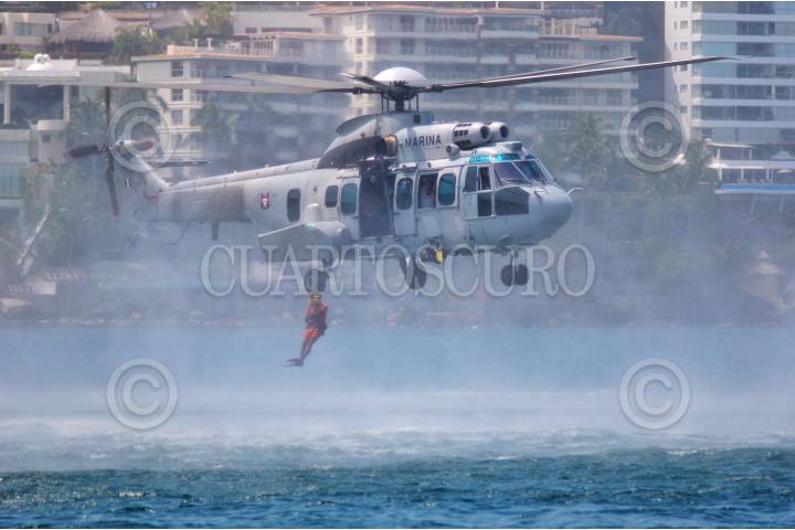 ACAPULCO, GUERRERO, 28MARZO2015.- Dentro de la Octava Región Naval de la Marina Armada de México, se encuentra la Estación Naval de Búsqueda y Rescate (ENSAR) la cual brinda atención para responder ante cualquier situación de peligro y auxilio marítimo. La estación cuenta con buques, embarcaciones, aeronaves y marinos que son capacitados en las instalaciones para resolver cualquier situación de peligro. Un helicóptero realiza un ejercicio de rescate arriando a un nadador en una canastilla. FOTO: DIEGO SIMÓN SÁNCHEZ /CUARTOSCURO.COM