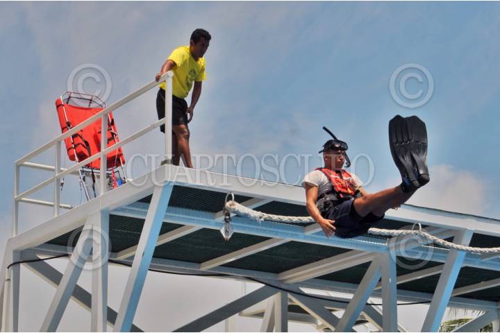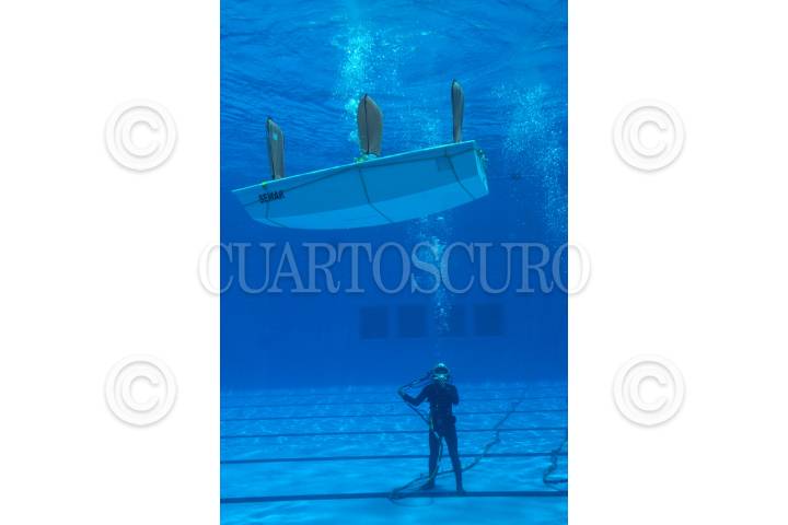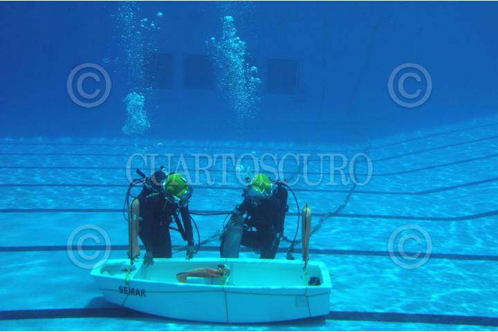 ACAPULCO, GUERRERO, 28MARZO2015.- Dentro de la Octava Región Naval de la Marina Armada de México, se encuentra la Estación Naval de Búsqueda y Rescate (ENSAR) la cual brinda atención para responder ante cualquier situación de peligro y auxilio marítimo. La estación cuenta con buques, embarcaciones, aeronaves y marinos que son capacitados en las instalaciones para resolver cualquier situación de peligro. Entrenamiento de buceo y rescate de un embarcación en una alberca de la escuela. FOTO: DIEGO SIMÓN SÁNCHEZ /CUARTOSCURO.COM