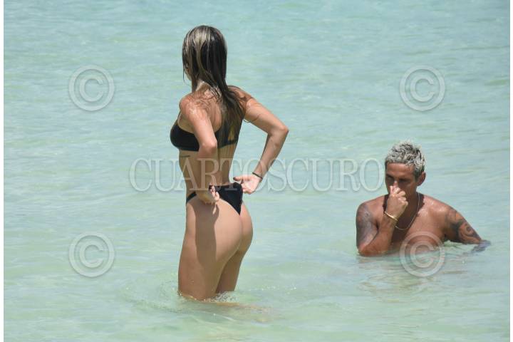 Una madre con su bebe juega en el balneario El Almeal