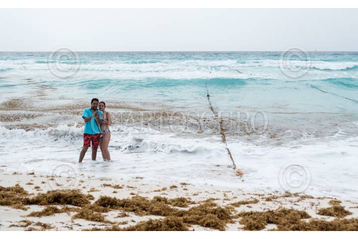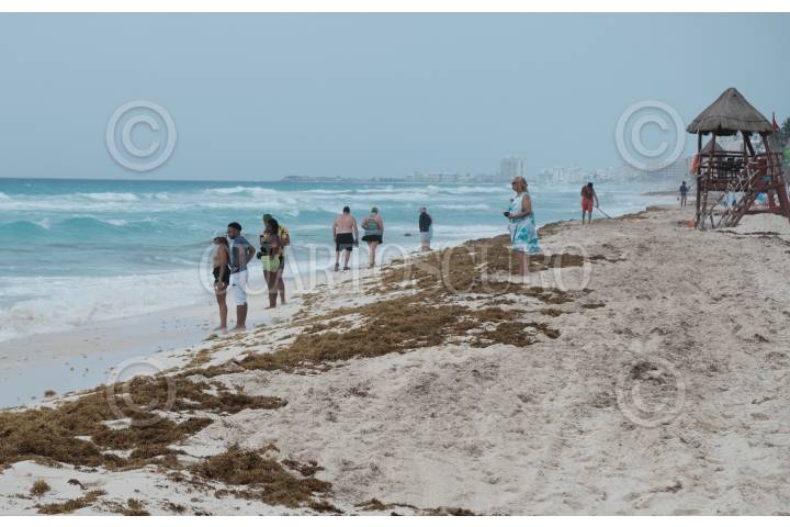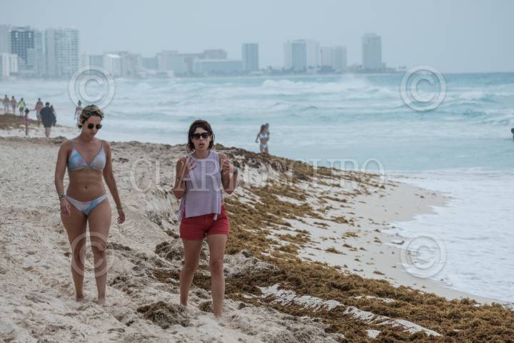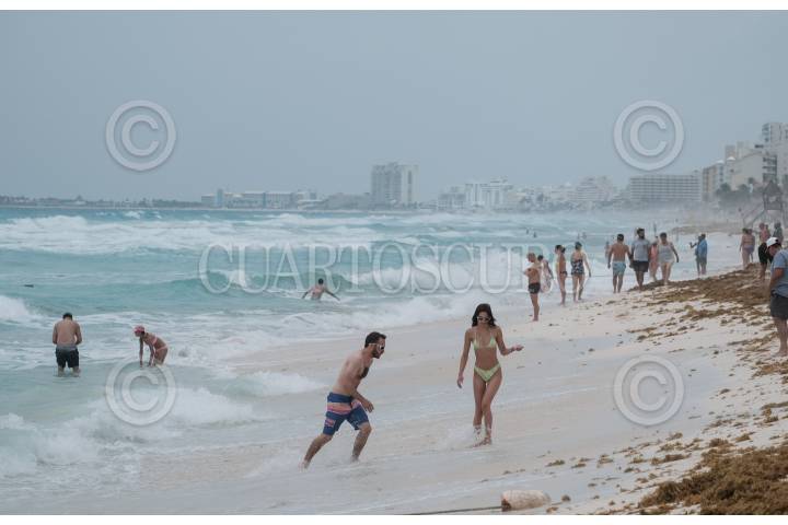 Bañistas pasean por la Playa Ballenas en Cancún, Quintana Roo, a pesar del mal tiempo que se vive en la entidad.