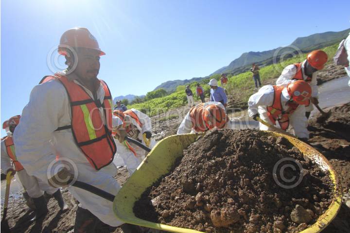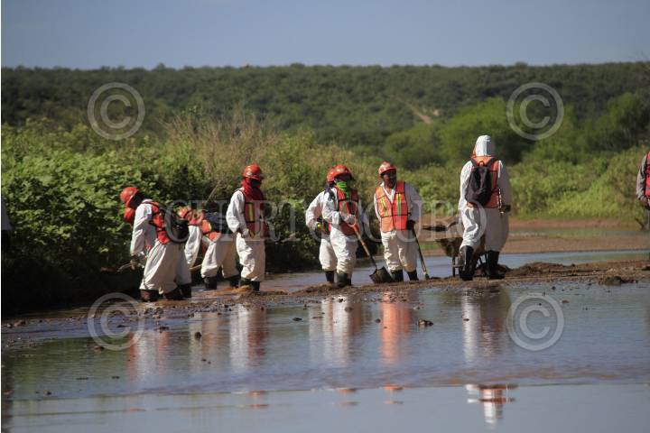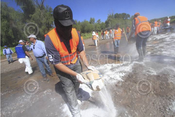 CANANEA, SONORA., 28AGOSTO2014.- Empleados de Grupo México y de empleo temporal del estado de Sonora realizan labores de limpieza en el Río Sonora y Bacanuchi, en el municipio de Arizpe. Como parte de la limpieza se remueve la tierra contaminada y se mezcla con cal para neutralizar los ácidos. El pasado 8 de agosto se registró una fuga en las tuberías de las instalaciones de Grupo México, que derivo en la contaminación de los ríos Sonora y Bacanuchi con 40 mil metros cúbicos de contaminantes altamente tóxicos. FOTO: MARGARITA GARCÍA /CUARTOSCURO.COM