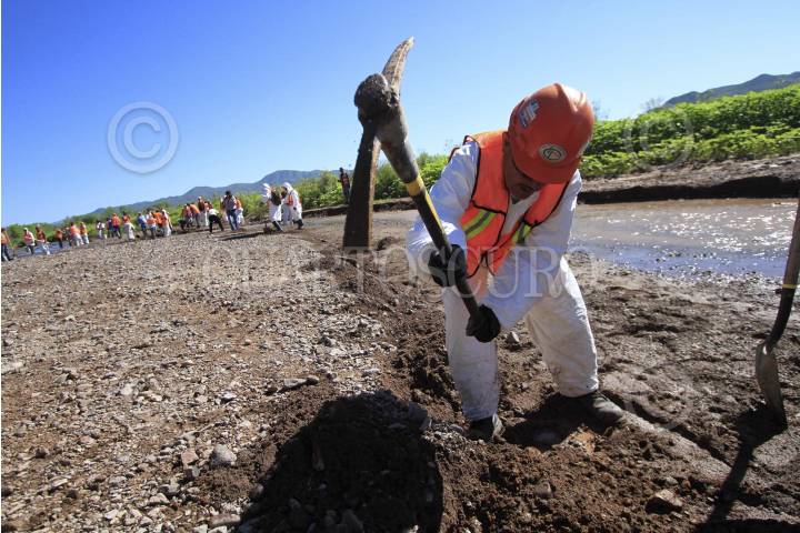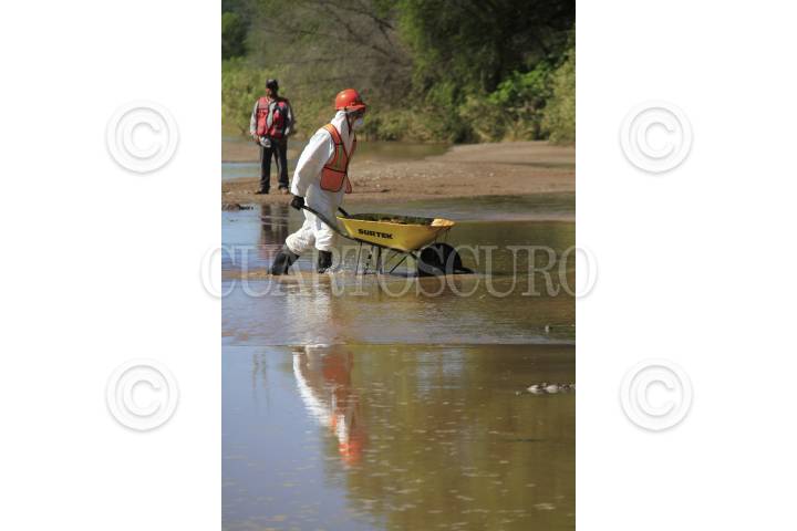CANANEA, SONORA., 29AGOSTO2014.- Empleados de Grupo México y de empleo temporal del estado de Sonora comenzaron ayer labores de limpieza en el Río Sonora y Bacanuchi, en el municipio de Arizpe. Como parte de la limpieza se remueve la tierra contaminada y se mezcla con cal para neutralizar los ácidos. El pasado 8 de agosto se registró una fuga en las tuberìas de las instalaciones de Grupo México, que derivo en la contaminación de los ríos Sonora y Bacanuchi con 40 mil metros cúbicos de contaminantes altamente tóxicos. FOTO: MARGARITA GARCÍA /CUARTOSCURO.COM