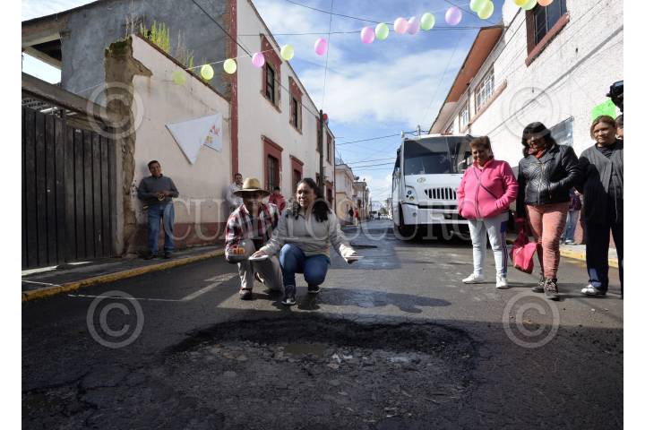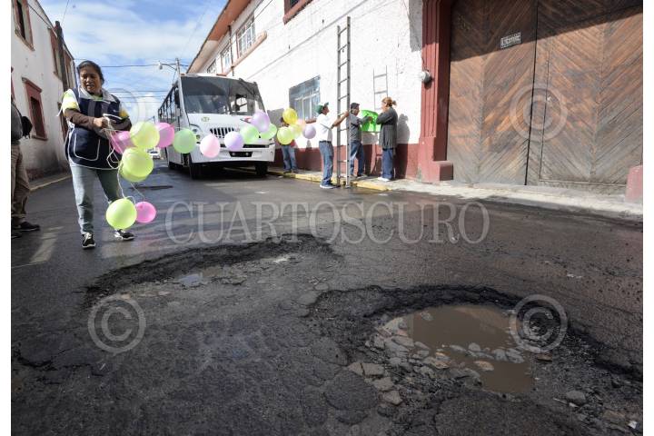 TOLUCA, ESTADO DE MÉXICO, 22AGOSTO2018.- Con mañanitas, pastel y velas, vecinos de Capultitlán, en Toluca, celebraron el tercer aniversario de los baches que se encuentran en la calle Hidalgo, a pesar de que autoridades municipales anuncian programas de bacheo, el problema de los baches continúa y la gente se encuentra molesta por esto. FOTO: ARTEMIO GUERRA BAZ /CUARTOSCURO.COM