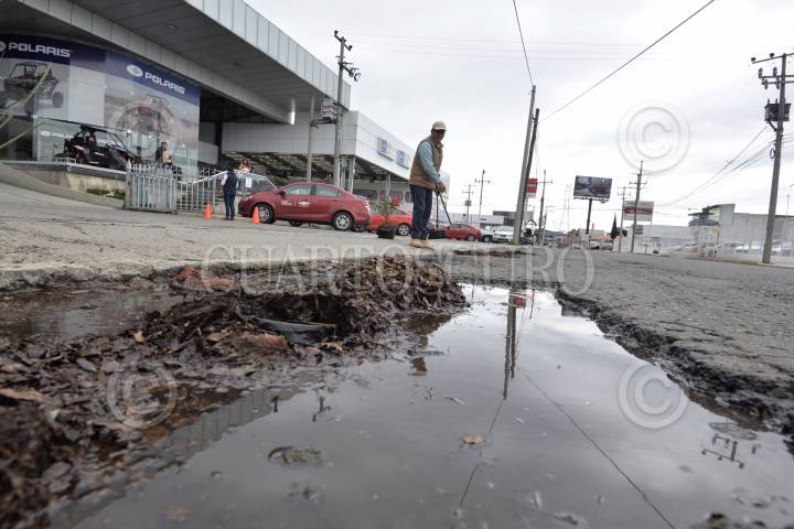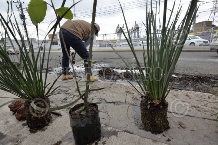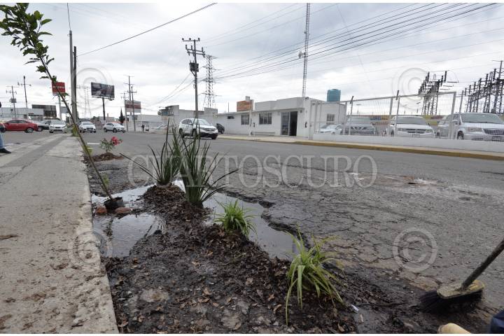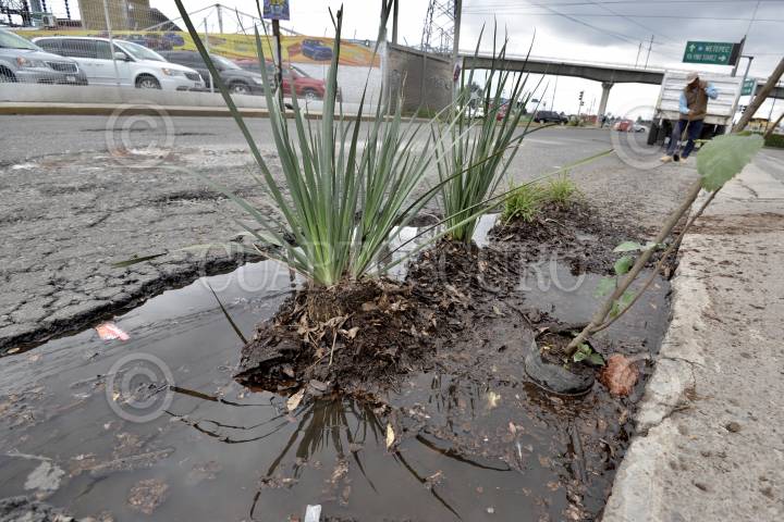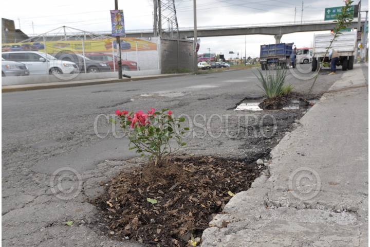 TOLUCA, ESTADO DE MÉXICO, 18OCTUBRE2018.- Comercios instalados en la avenida Diaz Mirón casi esquina con Las Torres colocaron plantas y árboles frutales en los baches qué hay en este lugar, ante la poca respuesta de las autoridades para resolver el problema de baches. FOTO: ARTEMIO GUERRA BAZ /CUARTOSCURO.COM