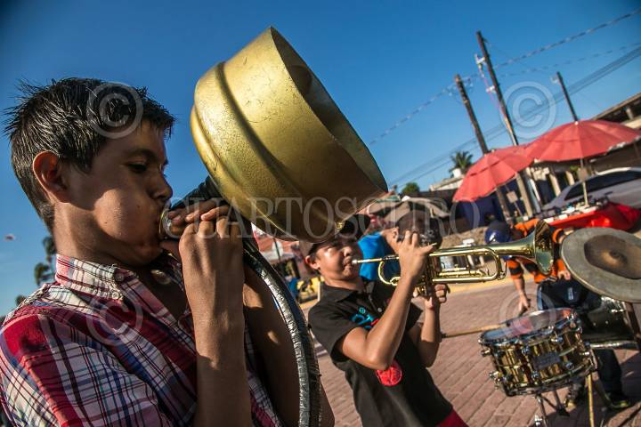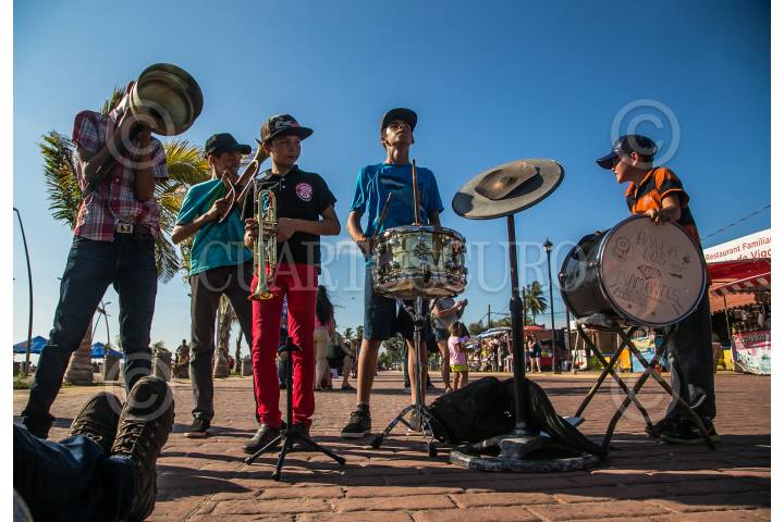 NAVOLATO,SINALOA, 09SEPTIEMBRE2015.- La agrupación ¨Diamante¨, conformado por niños de distintas edades, tocan al ritmo de la banda por el malecón de la Bahía de Altata. Los espectadores se deleitan con los jóvenes músicos, pues algunos de los instrumentos son elaborados por ellos mismos: un garrafón cortado a la mitad funciona como el clásico instrumento llamado "tuba". FOTO: RASHIDE FRÍAS /CUARTOSCURO.COM