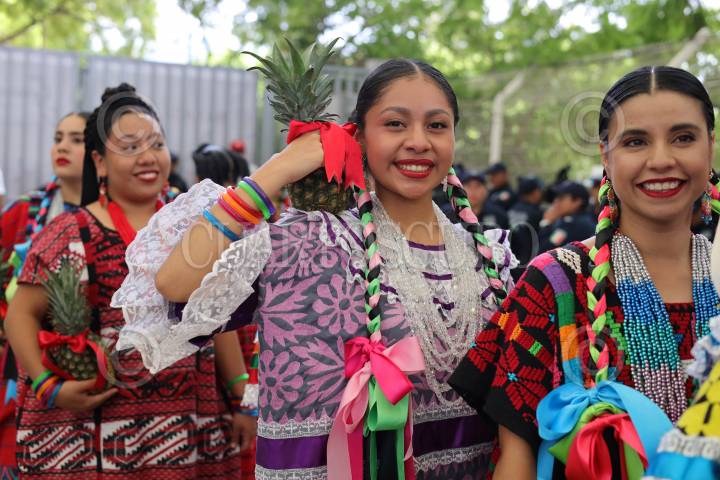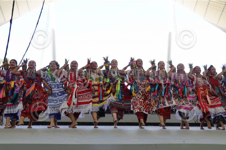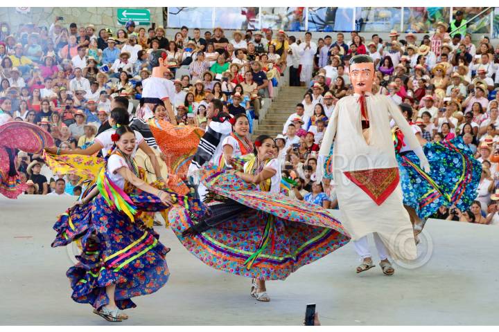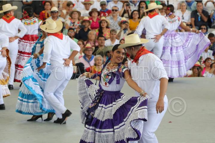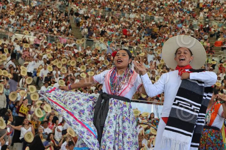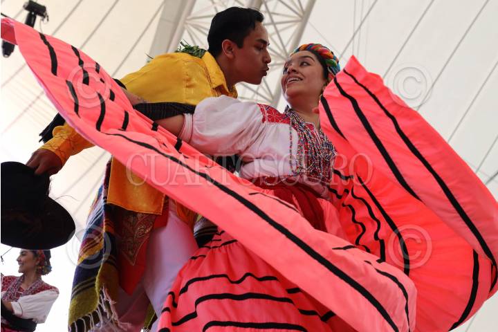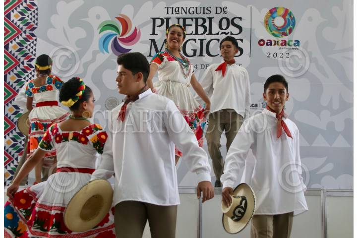Bailarines regionales de Oaxaca durante la ceremonia de pase de estafeta de Oaxaca a Hidalgo como sede del próximo Tianguis de Pueblos Mágicos.