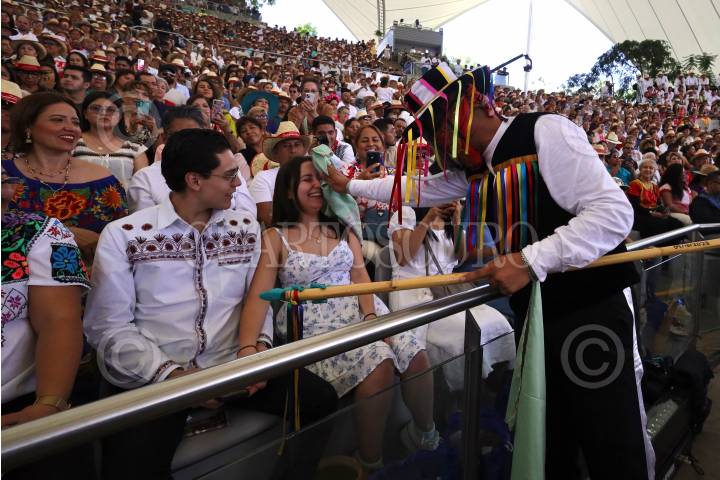 OAXACA, OAXACA, 22JULIO2024.- Leticia Ramírez, Irma Bolaños, Salomón Jara, Luisa María Alcalde Luján, Rosa Icela Rodríguez, y Alicia Bárcena, disfrutaron del primer Lunes del Cerro en el auditorio Guelaguetza. Mujeres y hombres ataviados con sus trajes típicos deleitaron a miles de asistentes a la fiesta étnica. FOTO: CAROLINA JIMÉNEZ/CUARTOSCURO.COM