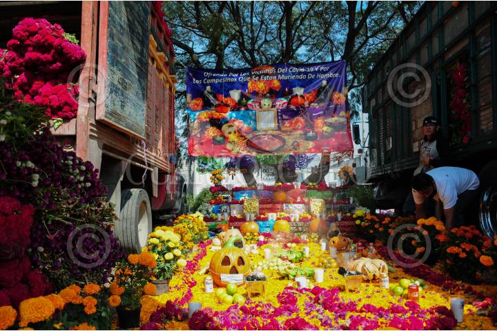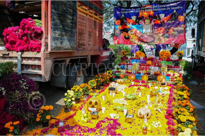 Ofrenda de Día de Muertos colocada en la Central de Abasto en honor a los comerciantes que han fallecido por Covid-19.