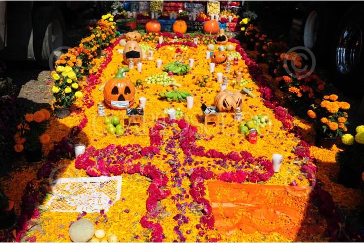 Ofrenda de Día de Muertos en la Central de Abasto, la cual fue colocada por los comerciantes.