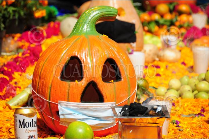 Elementos de la ofrenda de Día de Muertos en la Central de Abasto tienen puestos cubrebocas.