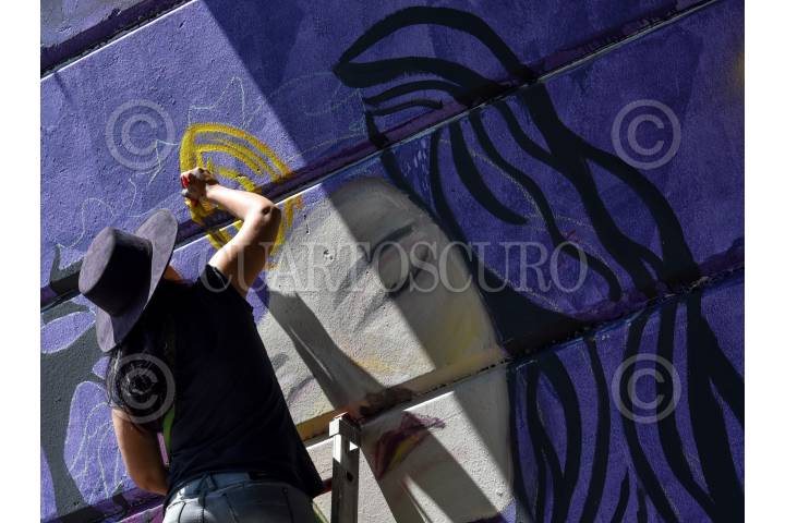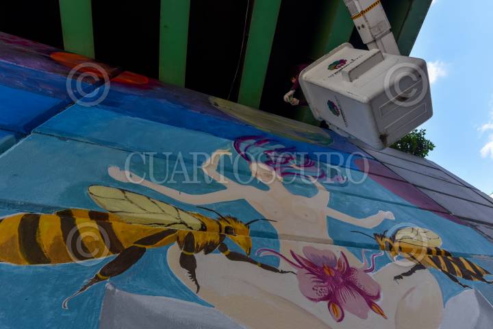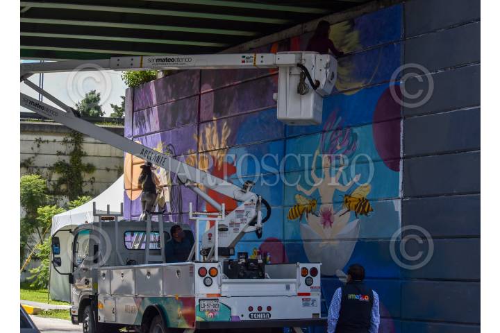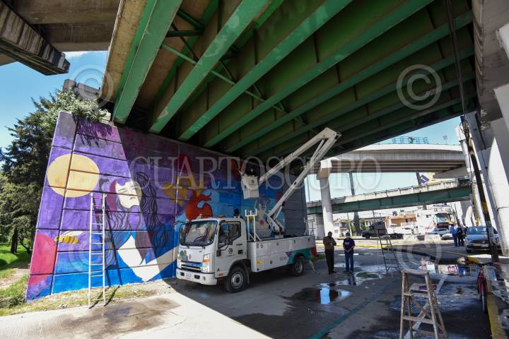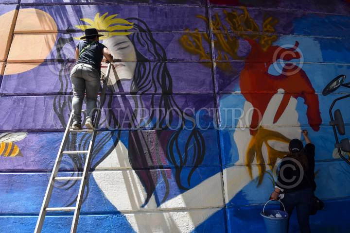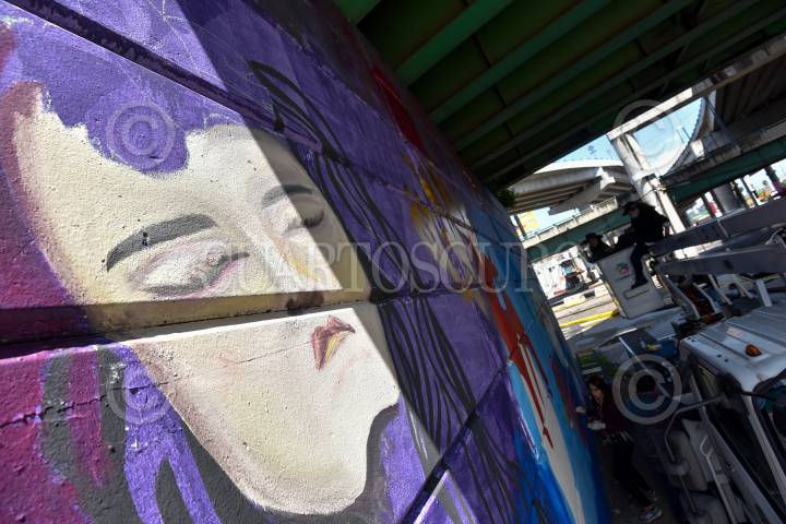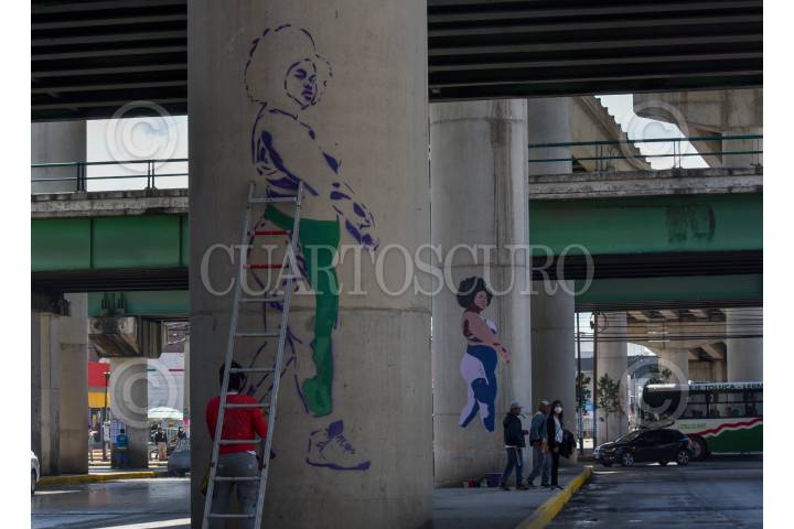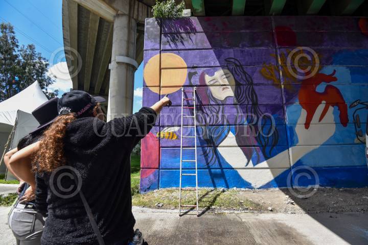 Mujeres artistas de Toluca realizan un mural contra la violencia de género en los bajo puentes de Paseo Tollocan.