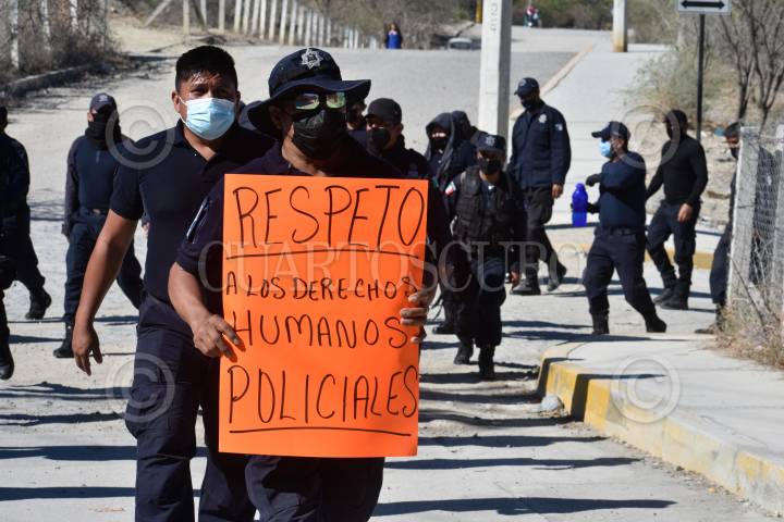 Policías del municipio de Eduardo Neri que mantienen un paro de labores marcharon para demandar a la alcaldesa Natividad López que se siente a la mesa de trabajo para darle soluciones sus demandas, como un alza salarial y mejoras en su equipo de trabajo.