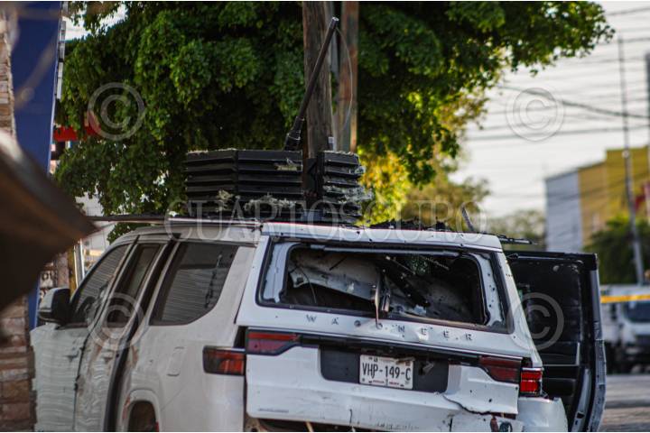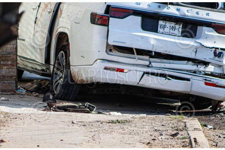 CULIACÁN, SINALOA, 15JUNIO2025.- Así quedó la camioneta: con impactos de bala y un arma calibre .50 empotrada, abandonada sobre la banqueta tras un enfrentamiento armado entre grupos antagónicos en la colonia Tierra Blanca. El hecho, ocurrido la madrugada del domingo 15 de junio, dejó tres civiles no identificados fallecidos y uno más herido. De acuerdo con los reportes, vecinos alertaron al 911 alrededor de las 3:53 horas tras escuchar múltiples detonaciones. Elementos de seguridad acudieron al lugar y aseguraron la unidad en avenida Álvaro Obregón, entre Sociólogos y Arquitectos. FOTO: JOSÉ BETANZOS ZÁRATE/CUARTOSCURO.COM