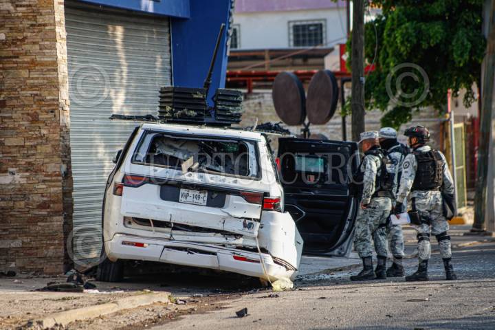 CULIACÁN, SINALOA, 15JUNIO2025.- Así quedó la camioneta Jeep blindada, con múltiples impactos de bala y un arma calibre .50 empotrada, tras un enfrentamiento armado entre grupos antagónicos registrado la madrugada del domingo 15 de junio en la colonia Tierra Blanca de Culiacán. El saldo fue de tres civiles no identificados fallecidos, uno más herido y el aseguramiento del vehículo. Según los reportes, vecinos alertaron al 911 alrededor de las 3:53 horas tras escuchar múltiples detonaciones. Autoridades de los tres órdenes de gobierno se movilizaron al lugar y localizaron la unidad sobre la banqueta de la avenida Álvaro Obregón, entre las calles Sociólogos y Arquitectos. FOTO: JOSÉ BETANZOS ZÁRATE/CUARTOSCURO.COM