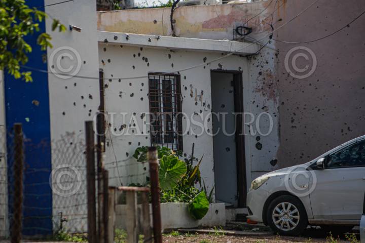 CULIACÁN, SINALOA, 05JULIO2025.– Una vivienda ubicada en la calle Eligio Ancona, entre las avenidas Ernesto Damy y General Fernando Cuén, en el fraccionamiento Antonio Nakayama, sector Barrancos, resultó con más de 200 impactos de arma de fuego en la fachada, cristales, puertas y ventanas, tras una balacera registrada en la zona. FOTO: JOSÉ BETANZOS ZÁRATE /CUARTOSCURO.COM
