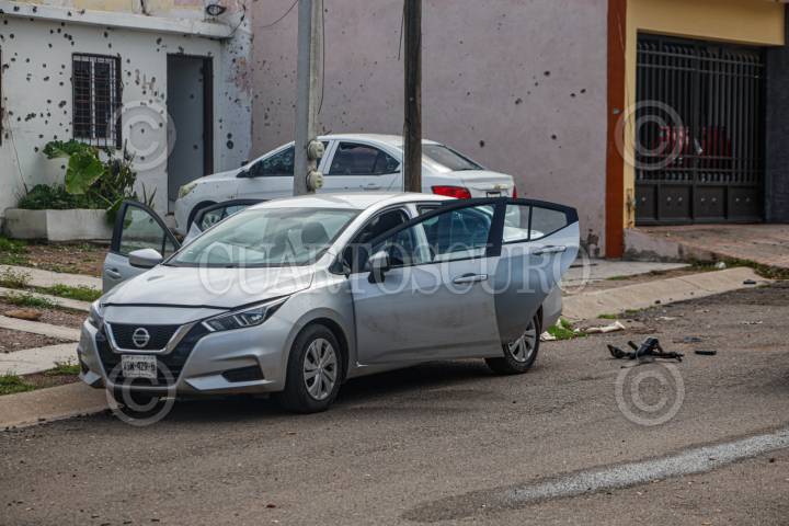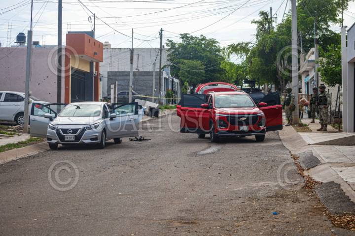 CULIACÁN, SINALOA, 05JULIO2025.– Una balacera se registró en una de las calles del fraccionamiento Antonio Nakayama, sector Barrancos, al surponiente de Culiacán. El enfrentamiento dejó daños en una vivienda y en un vehículo estacionado, además del aseguramiento de armas y vehículos. De acuerdo con autoridades, se aseguraron una camioneta Chevrolet Captiva y un automóvil Nissan Versa color plata, así como al menos un arma larga presuntamente utilizada en el tiroteo. La vivienda afectada, ubicada en la calle Eligio Ancona, entre las avenidas Ernesto Damy y General Fernando Cuén, presentó más de 200 impactos de arma de fuego en fachada, cristales, puertas y ventanas. Una unidad estacionada en la cochera también resultó con daños. Se reportó una víctima colateral, aunque no se ha confirmado su estado de salud. Elementos del Ejército Mexicano y corporaciones policiacas acudieron al lugar para asegurar la zona y realizar las investigaciones correspondientes. FOTO: JOSÉ BETANZOS ZÁRATE /CUARTOSCURO.COM