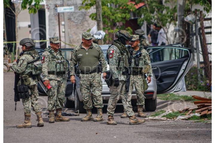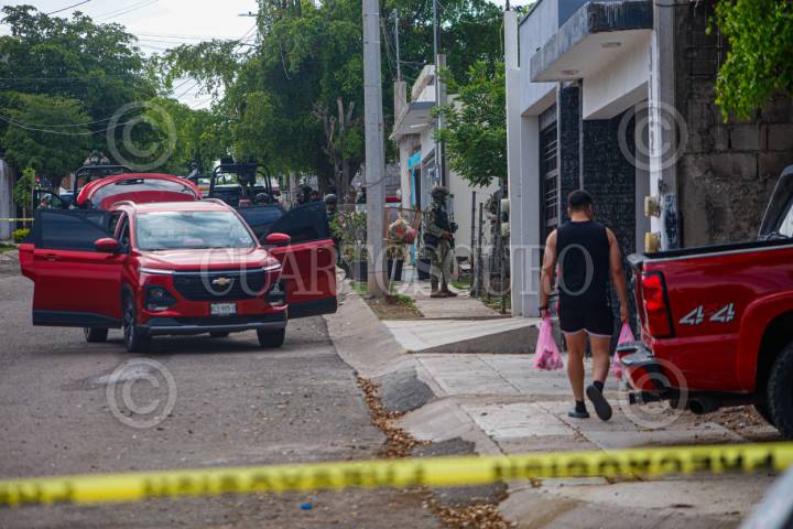 CULIACÁN, SINALOA, 05JULIO2025.– Elementos del Ejército Mexicano y corporaciones policiacas acordonaron la calle Eligio Ancona, en el fraccionamiento Antonio Nakayama, sector Barrancos, tras una balacera que dejó daños en una vivienda y un vehículo. FOTO: JOSÉ BETANZOS ZÁRATE /CUARTOSCURO.COM